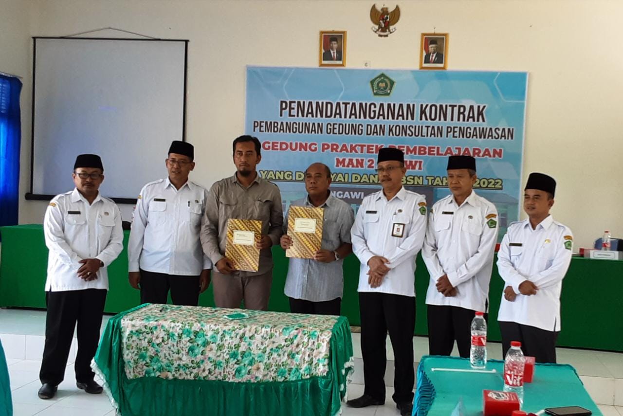 NGAWI ( Inmas ) - Kepala Kantor Kementerian Agama Kabupaten Ngawi Moh. Wahib didampingi Kasi Pendma Pujianto, Pengawas Madrasah Sumilan, Perencana, Pengelola Teknis dari PUPR, Kepala MAN 2 Ngawi Sugeng Wiyono beserta Komite Madrasah dan dewan guru menyaksikan penandatanganan Kontrak Kerja antara Pelaksana Cv. Marga Mulya dengan Masun Azali Amrullah selaku Pejabat Pembuat Komitmen (PPK) SBSN MAN 2 Ngawi, serta dilanjutkan dengan Konsultan Pengawas CV. Skala Pilar Lima, di Aula MAN 2 Ngawi, Senin, (4/7/2022)